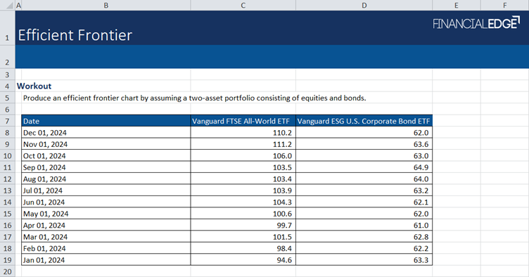 In this example we have an exercise that requires us to create an efficient frontier chart assuming a two-asset portfolio. Provided is monthly price data for the two assets – an equity and a bond index fund.