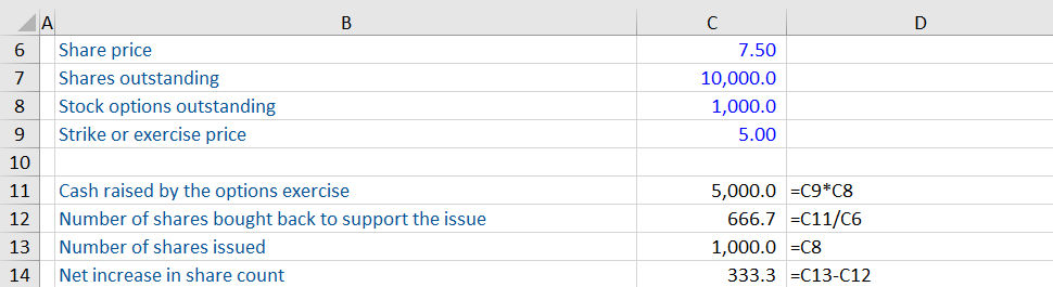 The cash raised by the exercise of the options is $5,000. In other words, when the employees exercise their options, they need to hand over $5 for every outstanding stock option they own. The company uses the $5,000 to purchase shares from the market. Given the share price of $7.5, it is only possible to purchase 666.7 shares from the market. However, the employees are expecting 1,000 shares and the company needs additional shares in order to meet this requirement. They therefore will have to create an additional 333.3 shares. The creation of additional shares is described as the dilutive effect of the stock options.