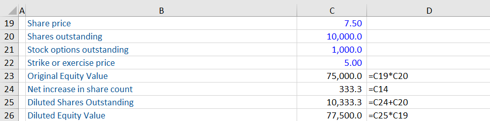 After this dilution, the number of shares outstanding increases to 10,333. And as a result, the diluted equity value increases to 77,500.