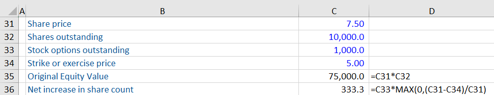 Stock options are widely used by startups, among other companies. Options serve as a reward to early employees who take on risk by joining an unknown company. Stock options give a direct incentive to executives to maximize performance and growth which ultimately contribute to increasing the company’s stock price. If the stock price increases, they expect to be rewarded by the capital appreciation of their share ownership. Where options form a very significant portion of the capital structure, bankers might opt to value the options using the Black Scholes or Binomial models rather than simply taking the intrinsic value as we do in the above calculations.