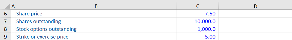 In the example, the company has 10,000 shares and 1,000 outstanding stock options. The exercise price is 5, which indicates that employees need to pay $5 to own one share worth of $7.5.