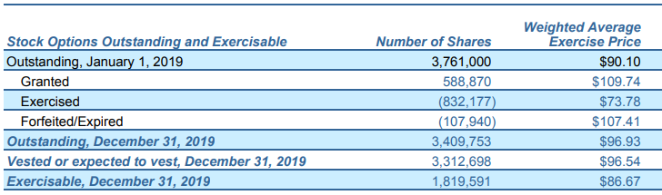 The information above is from PPG Inc’s 2019 10-K filing. The first five lines breakdown the changes to the options outstanding during the year – new options granted, options exercised, and lastly options which are forfeited (if people leave the firm) or expire without being exercised (if they aren’t in the money). Below the outstanding number at year-end are two lines, first, the amount vested or expected to vest and second the ones currently able to be exercised.