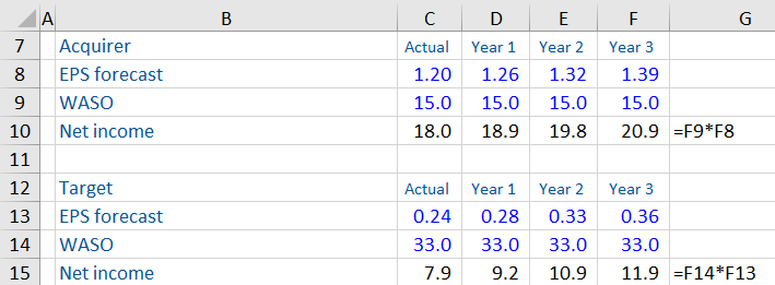 In the model diagram above net income has been calculated as EPS multiplied by WASO for both the acquirer and target.