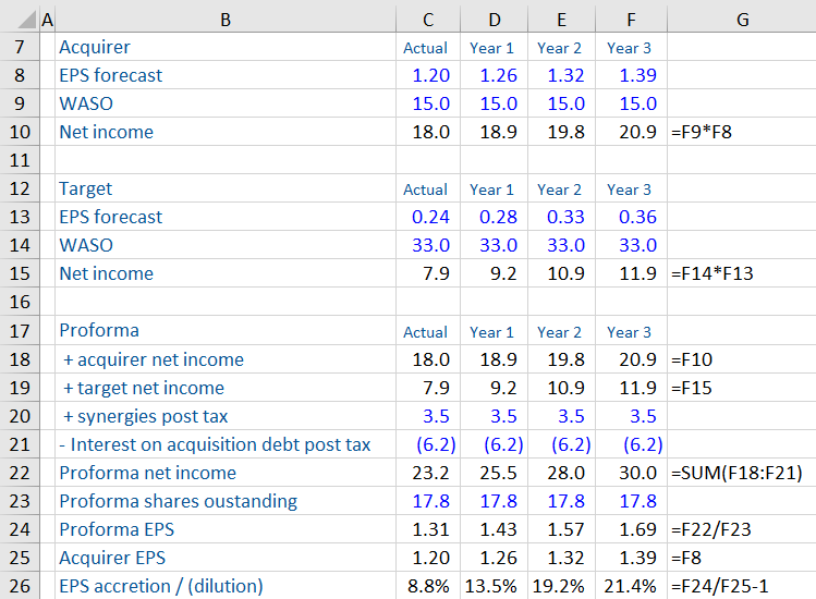 Finally, to calculate EPS accretion or dilution, we need to compare the pro forma EPS to the acquirer EPS. The acquirer’s EPS is seen in row 8 of the diagram, and is shown again in row 25, being EPS of 1.20 in the Actual Year column. The deal is accretive as pro forma EPS 1.31 is higher than the standalone EPS 1.20, producing EPS accretion of 8.8% in the Actual Year column.