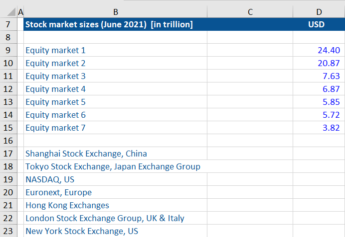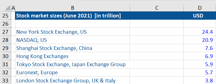 Given below are equity market sizes (in US$ trillion) of the currently leading equity markets in the world. Please try to allocate the correct market size to the correct stock exchange.
