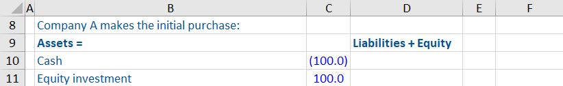 - Company A reduces its cash with $100 million and shows its investment in Company B.