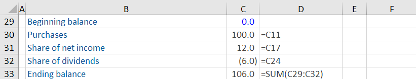 - Income generated by the investment is included in the investor’s income statement (at their % share) as well as the retained earnings account and the investment asset