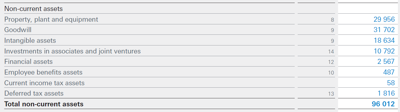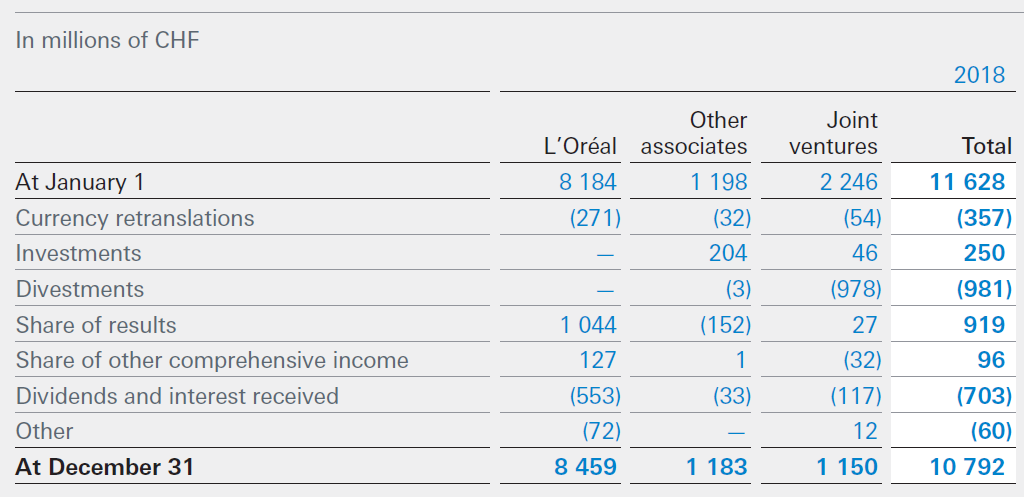 For L’Oreal, the 2018 year started with 8,184MM and Nestle then added its share of L’Oreal’s net income of 1,044MM (this number is different than the 919MM on the income statement as there were other associates and JVs, some of which were lossmaking so Nestle took their share of the other company’s losses). When Nestle receives dividends from L’Oreal these are deducted from the investment and added to the cash balance.