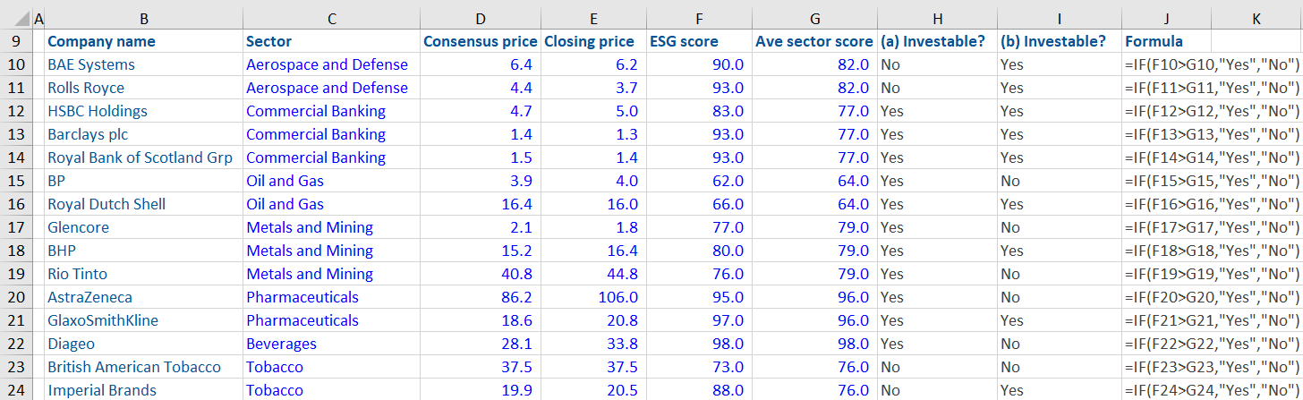 For this strategy, we can use the IF function in Excel to determine which companies’ ESG score (column F) is higher than the sector average (column G). For example, BAE Systems’ ESG score of 90.0 is higher than the sector average (82), so we can see a “Yes” next to it