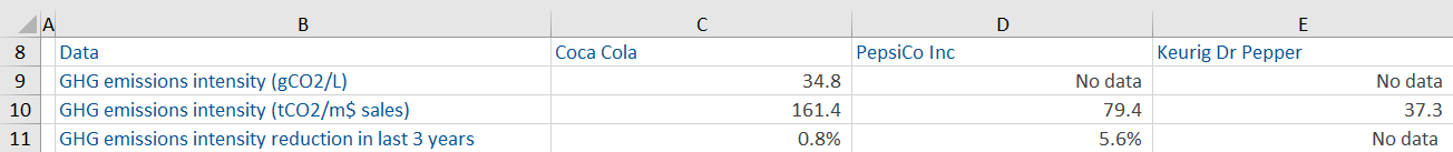 Based on this metric, Coca Cola has seen the lowest reduction in its emissions intensity for the past 3 years. PepsiCo has seen the highest reduction, while no data is available for Keurig Dr Pepper.