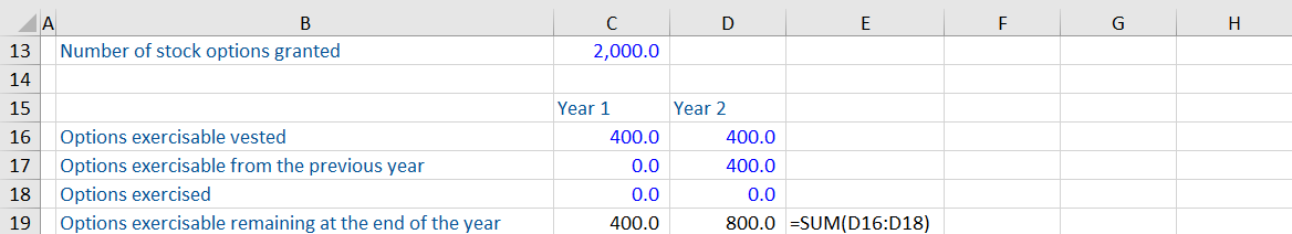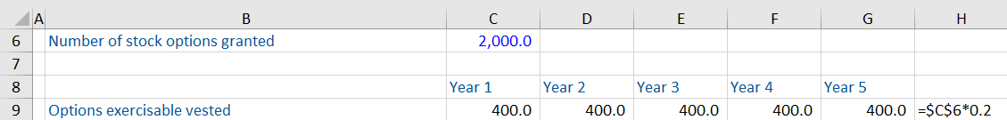 Next year, a further 20% or 400 options will become exercisable. At this point, the number of options exercisable is 800.