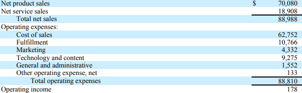 The extracts show Amazon’s income statement for the year ended 31st of December 2016. Cost of sales is included within operating expenses instead of being reported separately. All other operating expenses reported relate to supporting Amazon’s sales (SG&A). Marketing is a great example of an expense that increases sales but is not directly tied to the production of a product or service.