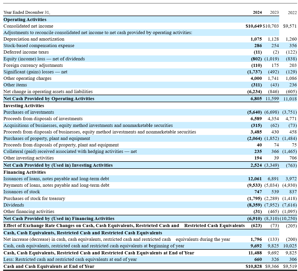 This statement shows the company’s revenues and expenses during a specific period, resulting in a net profit or loss. This is an extract from Coca-Cola’s 2024 10k (or annual report).