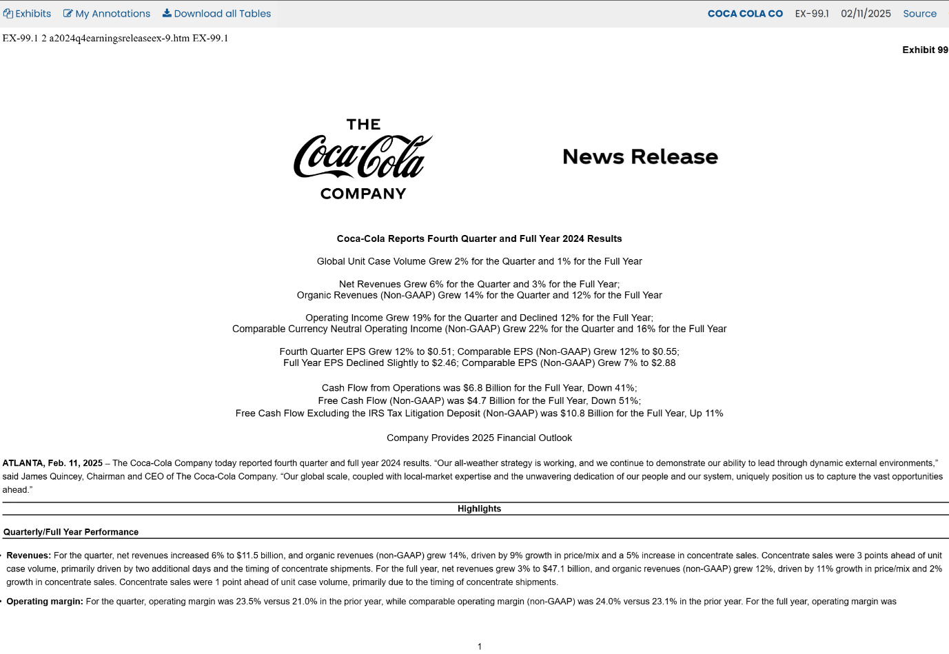 This is Coca-Cola’s press release to accompany the 2024 full year results being released. The headline commentary notes the volume and revenue changes for the year as well as operating income and EPS for both Q4 and the full year.