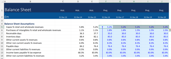 For example, let’s assume a company has announced a new large 4-year growth strategy. If we are to model this, it will mean making changes to sales, capex and some other costs within the company. When updating the Capex assumptions (as shown below), it is important to complete all the capex assumptions in the forecasts before making other changes. Modelers must always check that these planned changes feed through to all the dependent cells as expected before moving onto the next edit.
