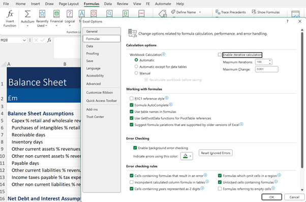 2. Turn off iterations: Go to File, Options in Excel (ALT F, T) navigate to the Formulas tab and untick the box that enables iterative calculations. This way, if you accidentally create any circular references, you’ll receive a warning and can stop to figure out what’s going wrong. You should also turn off any intentional circular references.