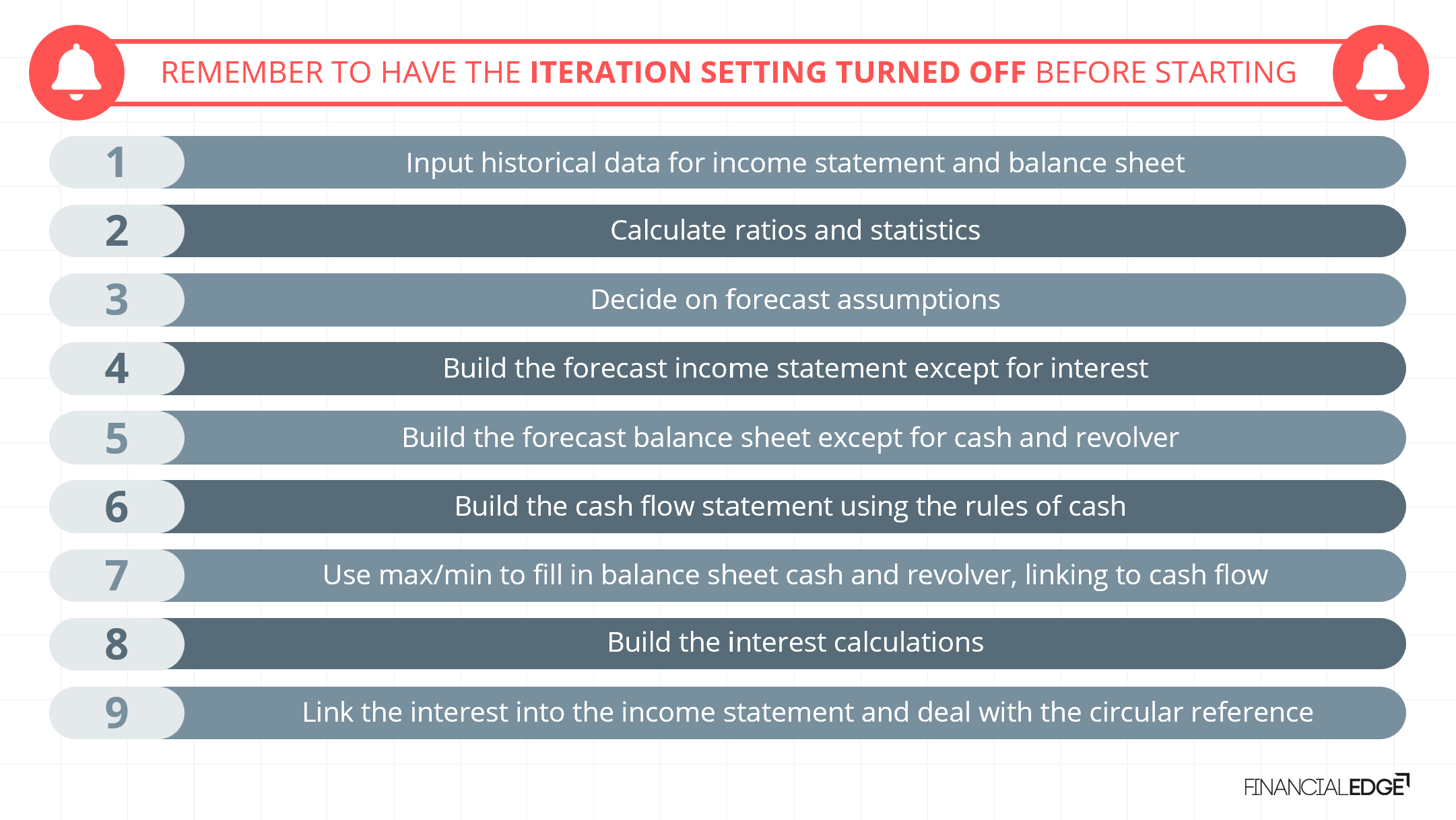 Working methodically and consistently through these steps of financial modeling provided will ensure analysts are able to create accurate models and forecasts for both themselves and future users.