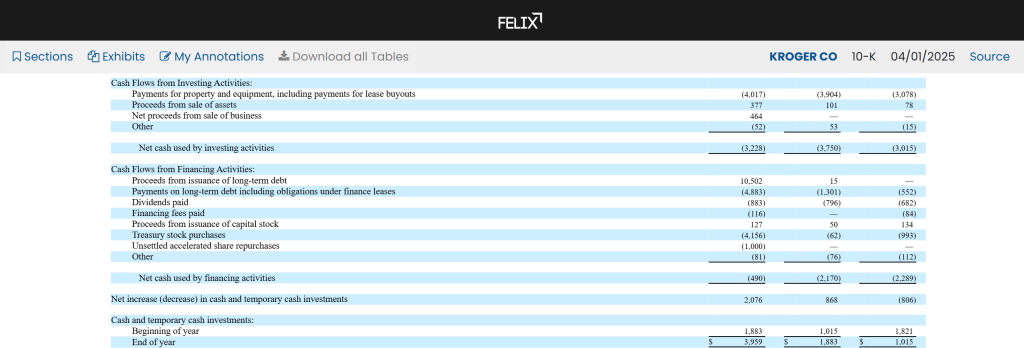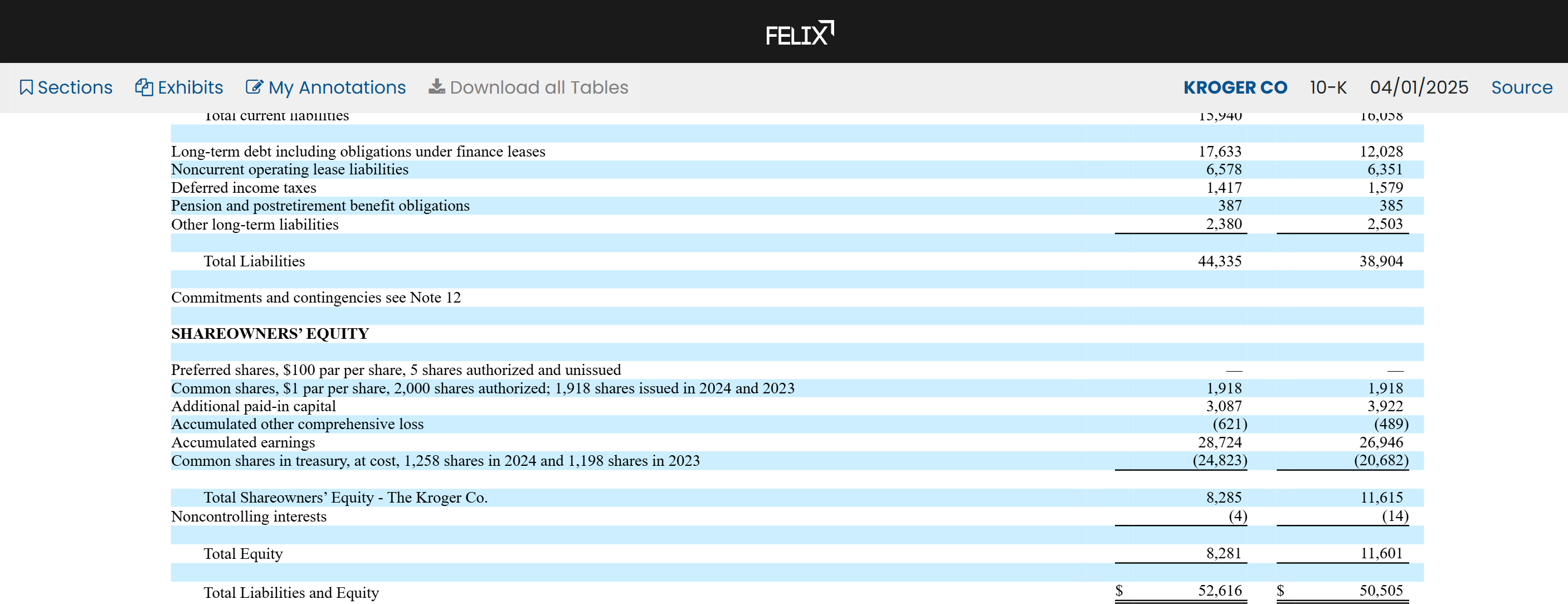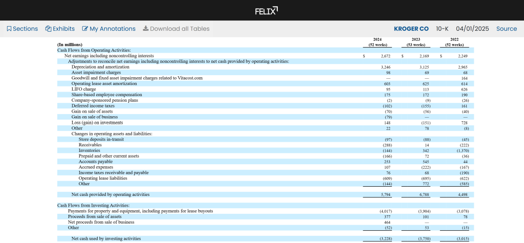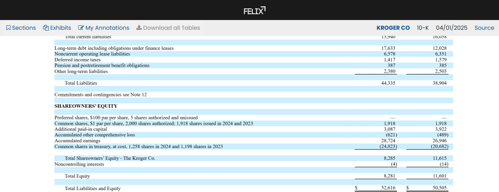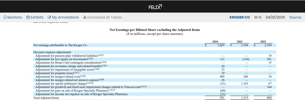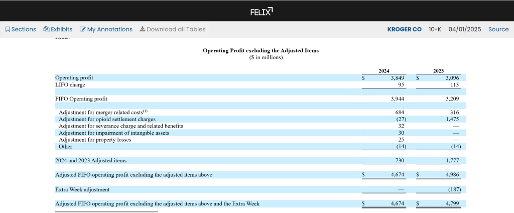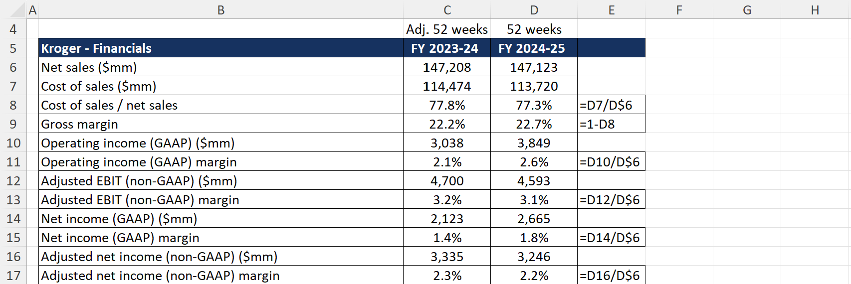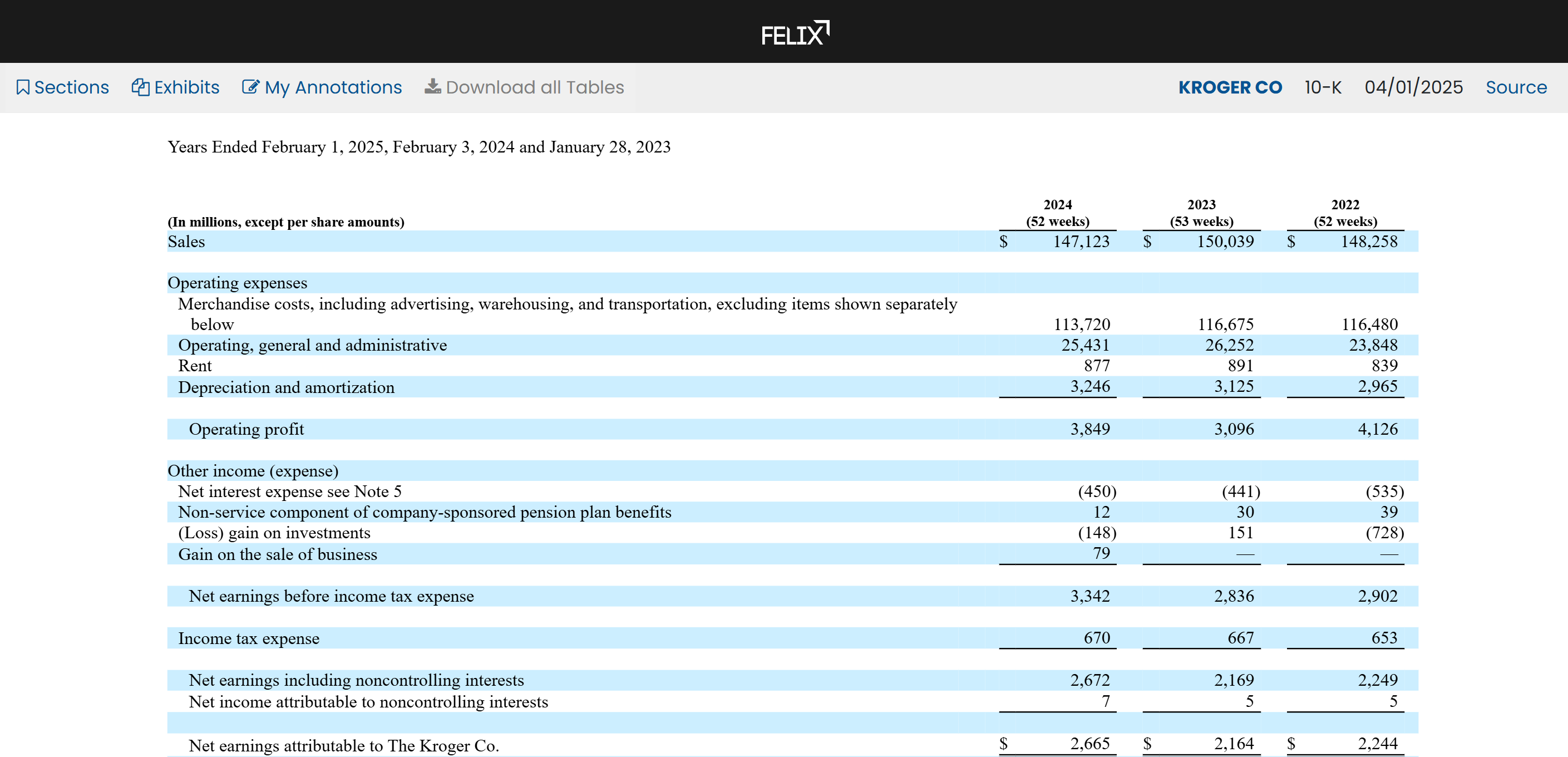 - Cost of sales slightly decreased from 77.8% of sales to 77.3% of sales in FY 2024. This reflects Kroger’s improved efficiency in managing product costs and related operational expenses.