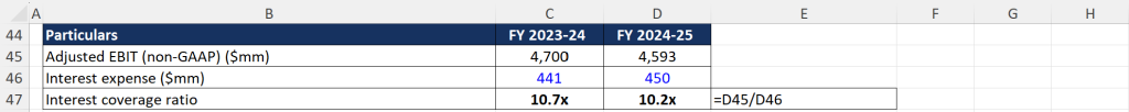 EBIT slightly declined, and interest expense rose marginally, reducing interest coverage from 10.7x to 10.2x, though it remains strong.