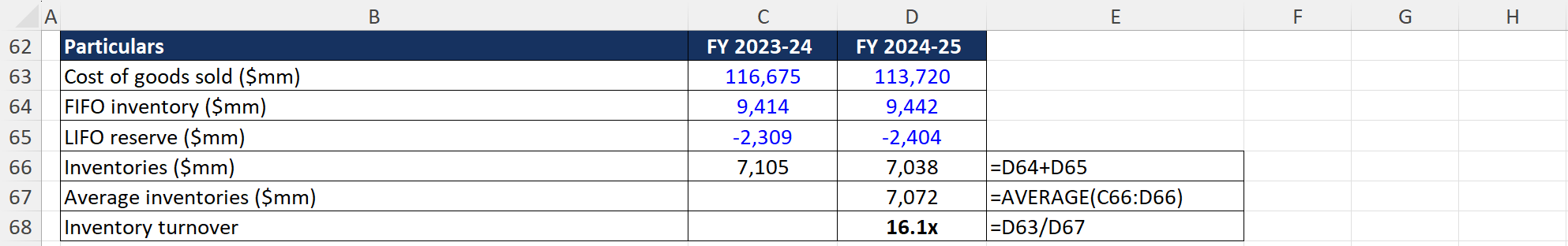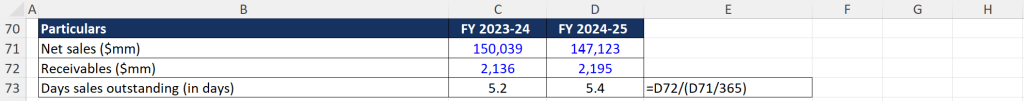 Inventory turnover is high at 16.1x, meaning the company sells and replaces its inventory approximately 16 times during the financial year. A high inventory ratio generally indicates efficient inventory management because it suggests that the company maintains the optimal inventory levels, minimizing carrying costs such as capital expenses, warehousing, insurance and potential shrinkage