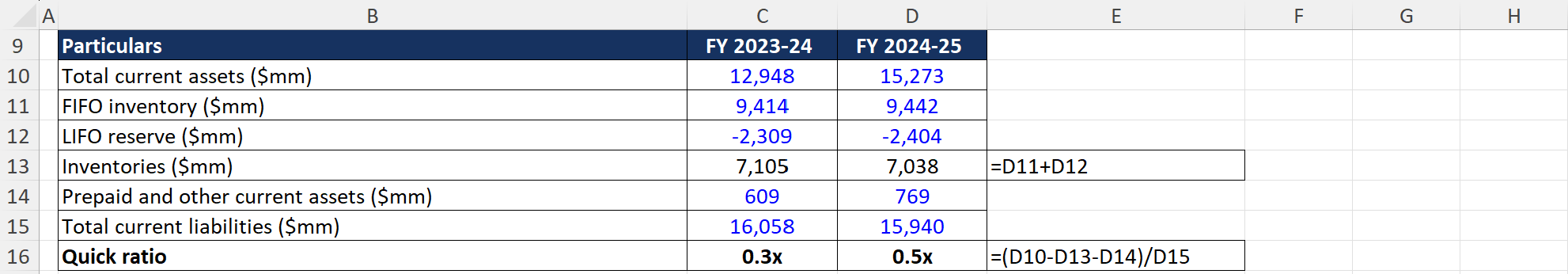 When subtracting inventories and prepaid assets from current assets, the quick ratio remains weak but improved from 0.3x to 0.5x.