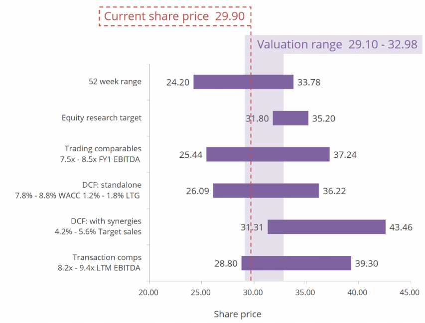 Finally, the football field should highlight the acquisition value range. In the aforesaid example, the valuation range is between 29.10 and 32.98 per share. Notably, this range overlaps with the results obtained from all the valuation methodologies mentioned above.
