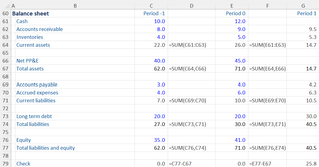 It is important to check that the balance sheet ‘balances’. The modeler can add a ‘Check’ line which simply takes the sum of total liabilities and equity and minus the total assets. If the balance sheet balances, this should come to zero, as it does here in our example. Again, once working, this can be copied across to subsequent years.