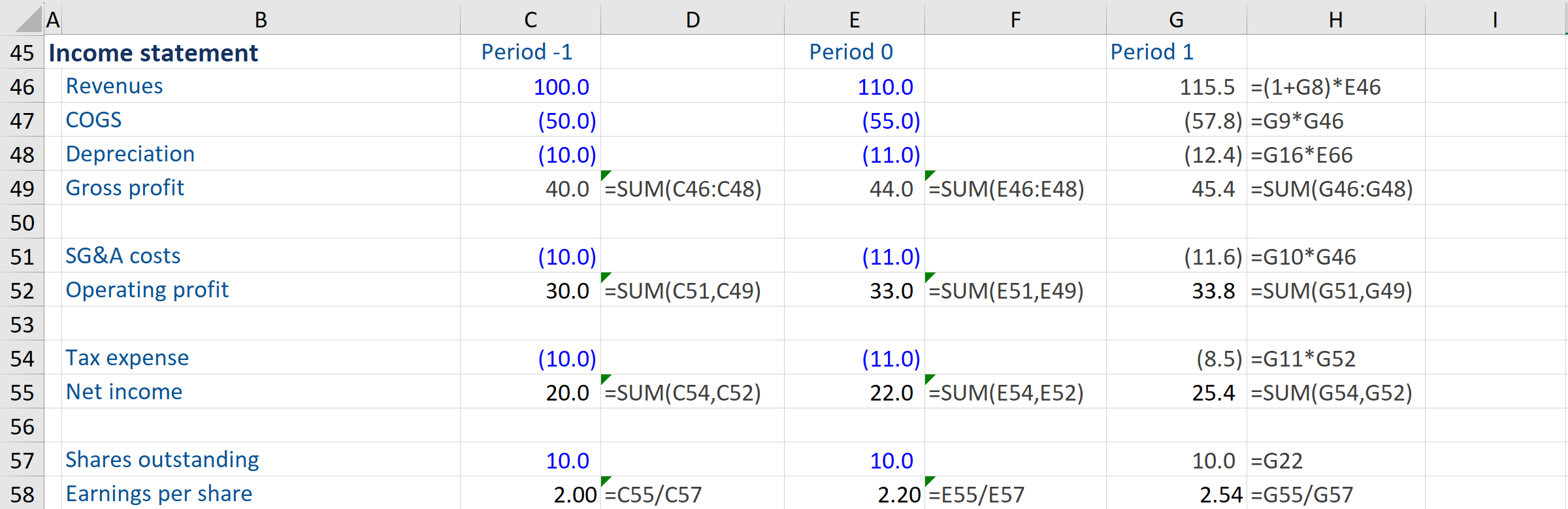 Earnings per share is calculated as net income divided by the number of shares outstanding. We do this calculation for the first historical period first (Period -1) and then copy it through to Period 0. Then for Period 1, we calculate the EPS by taking the share outstandings assumption of 10 million shares for Period 1 (forecast period) and dividing forecast net income for Period 1 by the shares outstanding.