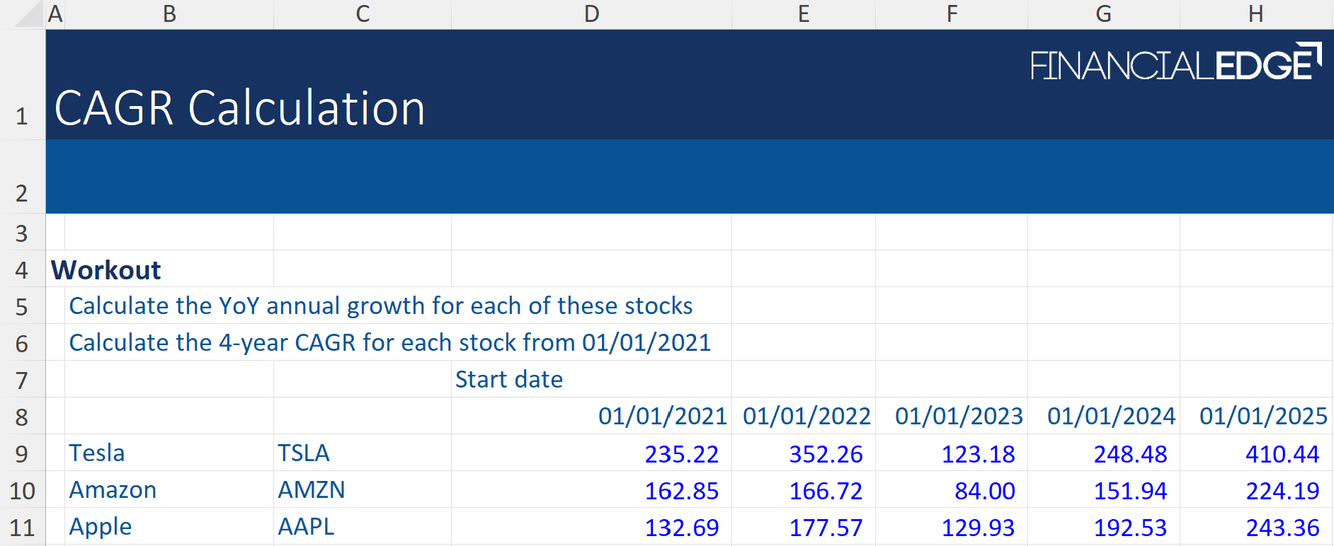 Access the free Financial Edge template to calculate CAGR formula for stock price returns