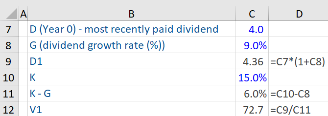 Given below is the computation of the intrinsic value of a stock, based on the Dividend Discount Model stated above. We assume that a company has just paid its annual dividend of $4 per share to its shareholders and its dividend growth rate is 9%. The dividend expected next year is $4.36. The discount rate or the cost of equity capital is 15%. Using the DDM formula, the intrinsic value of the stock is $72.7.