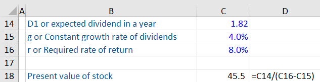 The result indicates that the stock is worth $45.5. The current market price is $30, therefore, it is undervalued and is worth considering.