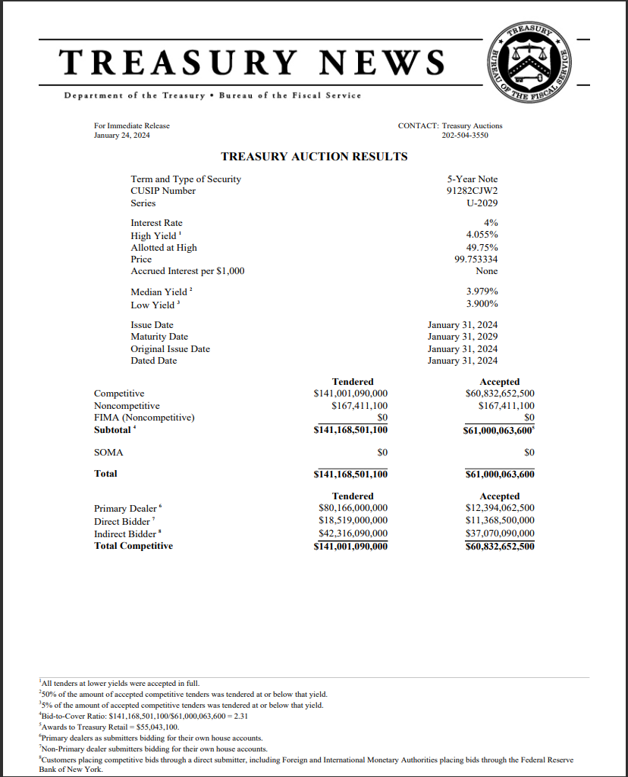 Here is an example of a US Treasury Auction result. These are released by the US Department of the Treasury once an auction is complete. The results will show the bid-to-cover ratio as well as the types of bidders in the auction.