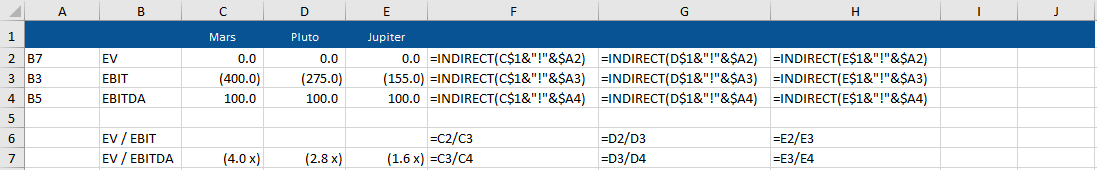Notice that for each individual company the model is laid out identically, for example, the Enterprise Value always appears in cell B7. So, if I want to return the EV for Mars on my dashboard, the reference I need to feed into the indirect function is: