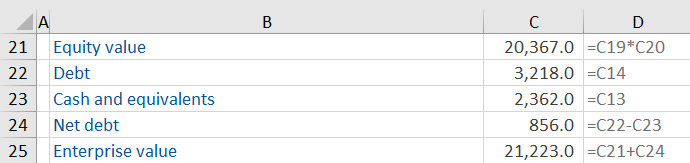 Next, based on the equity value and the net debt (debt less cash and cash equivalents), the enterprise value has been calculated.