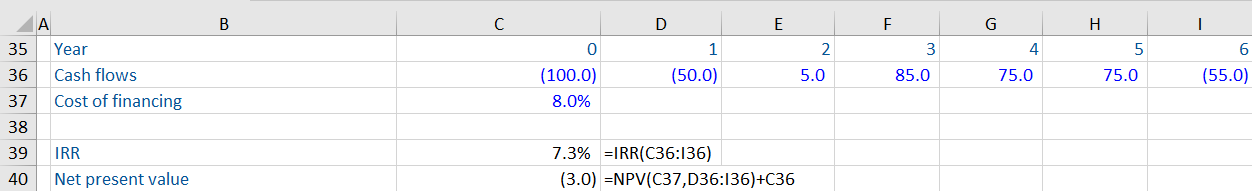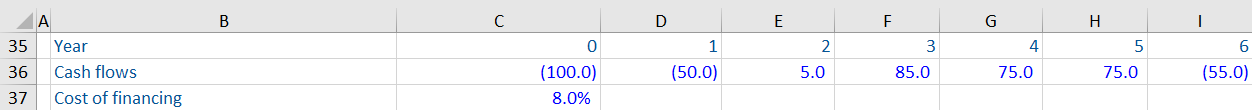 As expected, because the cost of financing (8%) is higher than the annual returns (7.3%) from the project, the NPV is negative. If you invest in this project, you will end up losing cash.