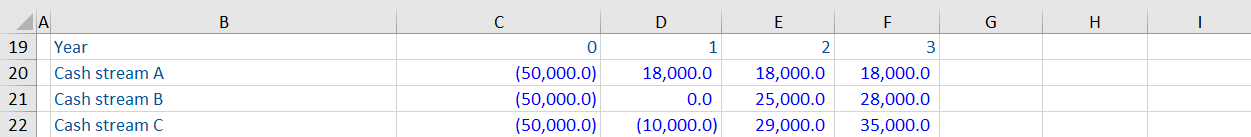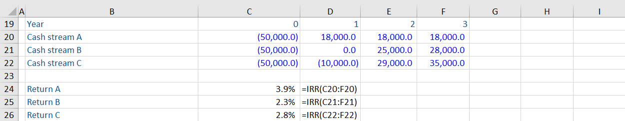 Using the IRR function in Excel, you can get the returns for each of these streams as follows: