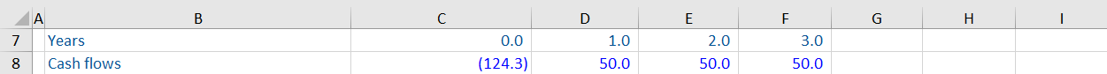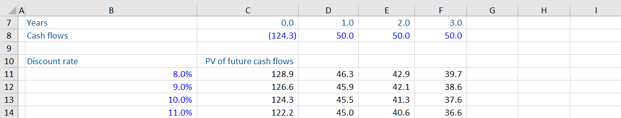 Using a discount rate of 8% and 9% results in the present values of future cash flows being higher than the original investment. However, at a discount rate of 10%, the present value of the returns equals $124.3. And that is the internal rate of return (IRR) for this investment – the annual return is 10%, and the discount rate that would give an NPV of zero is 6%.