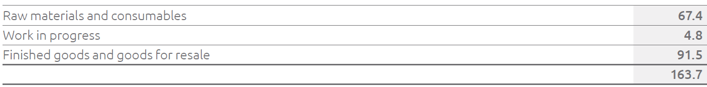 - Inventory is made up of a mix of finished goods, work in progress and raw materials