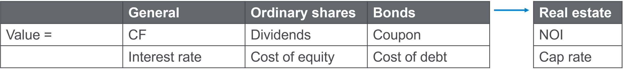 - The key valuation metric for direct property investments are Cap rates (yield equivalent) and net operating income. The cap rate equals Net Operating Income/ Real Estate Value