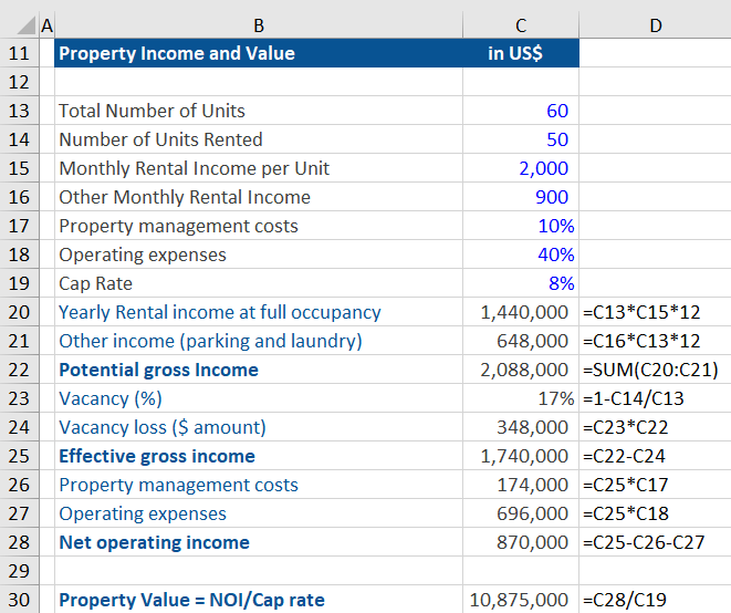 A 60-unit apartment building rents for $2,000 per unit per month. Operating expenses, including property taxes, insurance, maintenance, and advertising, are typically, 40% of effective gross income. Other income from parking and laundry is expected to average $900 per rented unit per year. The Cap rate is 8% and the property manager is paid 10% of effective gross income. From these inputs, we obtain a property value of $10,875,000 which you can see below.