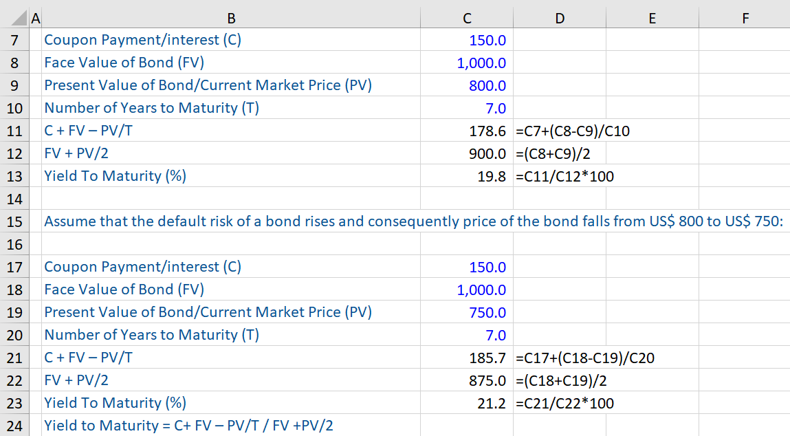 A workout of the calculation of the yield to maturity (%) has been given below. Further, when a bond becomes more subject to default risk, then its price falls. Consequently, the bond’s yield to maturity increases i.e. rises.