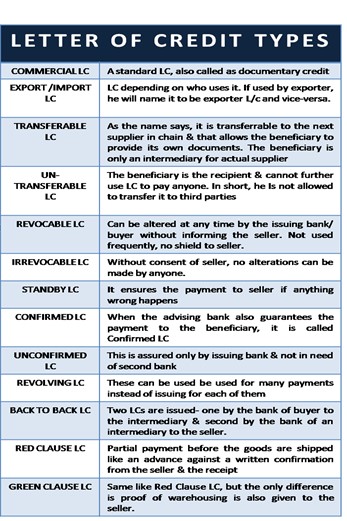 - There are many different types of letters of credit including basic types (e.g. confirmed versus unconfirmed) and special types of Letters of Credit (e.g. Red Clause LC)