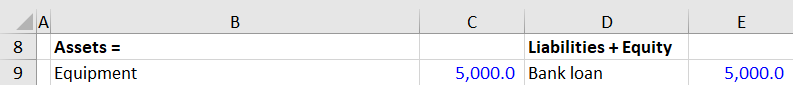 A second company needs to buy equipment. They purchase the equipment with a bank loan for $5,000 balance.