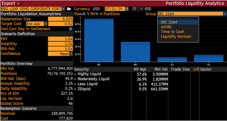 Investors can also use various data platforms such as the Bloomberg Terminal to assess and model liquidity. Below is an example of what a portfolio liquidity analysis looks like: