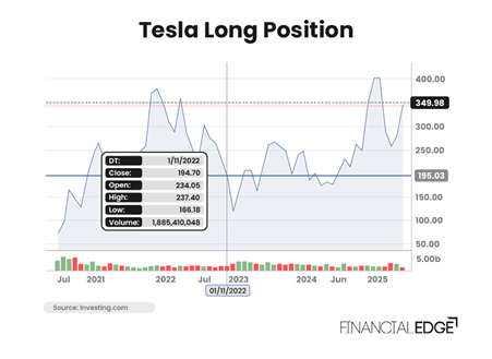 Let’s suppose that an investor believes that Tesla’s outlook is good due to future higher demand for electric vehicles. However, the current share price looked high, and the investor had to wait until it dropped to the desired level. Then, on the 1st of November 2022 following a price decline, he purchases 100 shares at $235 each as per the chart below.