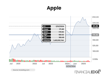 Three months later, the price drops down to $175, but the investor believes it could go further down. This was not the case, the stock recovered to the $190 level and even went up to $199 at which point the investor was making a loss. However, on the 1st of March 2024, the share price reached the investor’s desired level, and the short position was closed at $170 per share (as per the chart below).