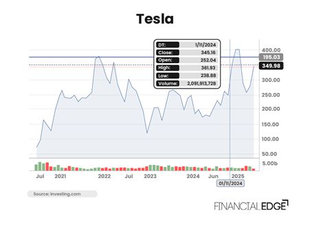 The stock had been volatile, and its price kept fluctuating, but the investor held the stock for exactly two years and decided to sell on the 1st of November 2024 (as shown below) at $350 per share.