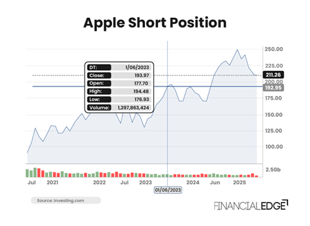 Following Apple’s remarkable share price growth, an investor conducts some fundamental research and concludes that its share price is above its fair value. He thinks that a correction is immediate and on the 1st of June 2023 initiates short position on the stock by selling 100 shares at $190 per share. The trade is illustrated below.