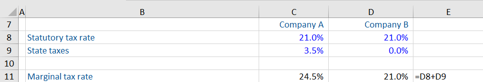 Here, we have assumed that Company B is operating in a state with no state taxes. As a result, it has a lower marginal tax rate when compared with Company A.