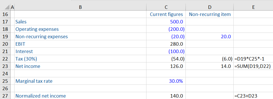 The marginal tax rate is used to tax adjust income statement items in the calculation of normalized net income. Normalized net income is an important metric in trading comparables and represents the recurring profit available to common shareholders. Non-recurring items are removed to calculate a “cleaned” net income figure. It also has many other applications in valuation, LBO analysis and credit analysis.